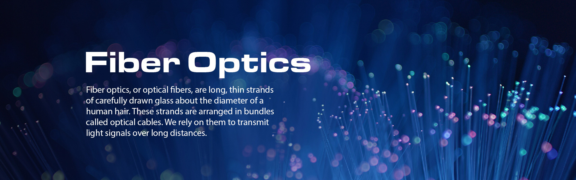 Fiber optics, or optical fibers, are long, thin strands of carefully drawn glass about the diameter of a human hair. These strands are arranged in bundles called optical cables. We rely on them to transmit light signals over long distances.​